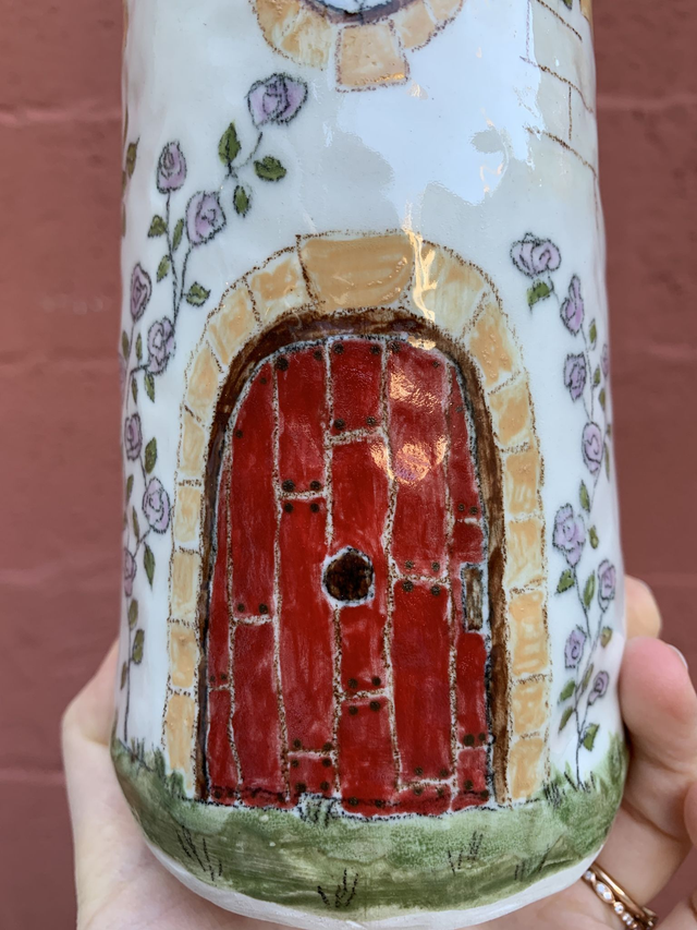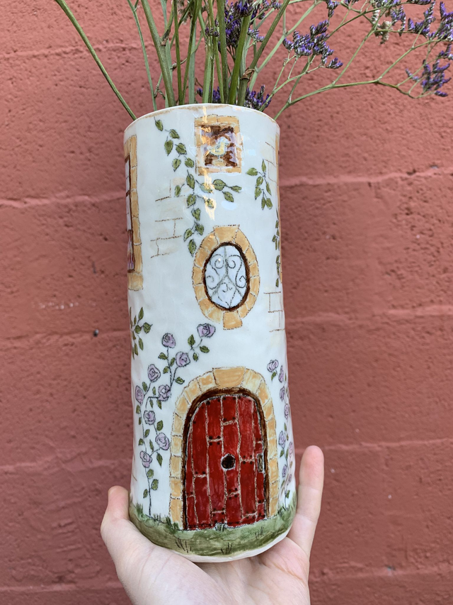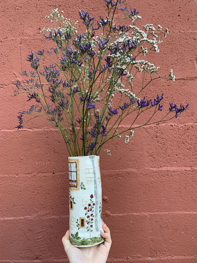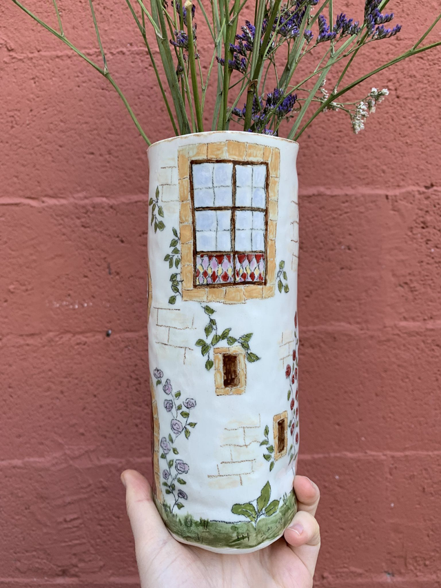 Vase en grès porcelainique décoré patiemment à la main au crayon oxyde et engobe